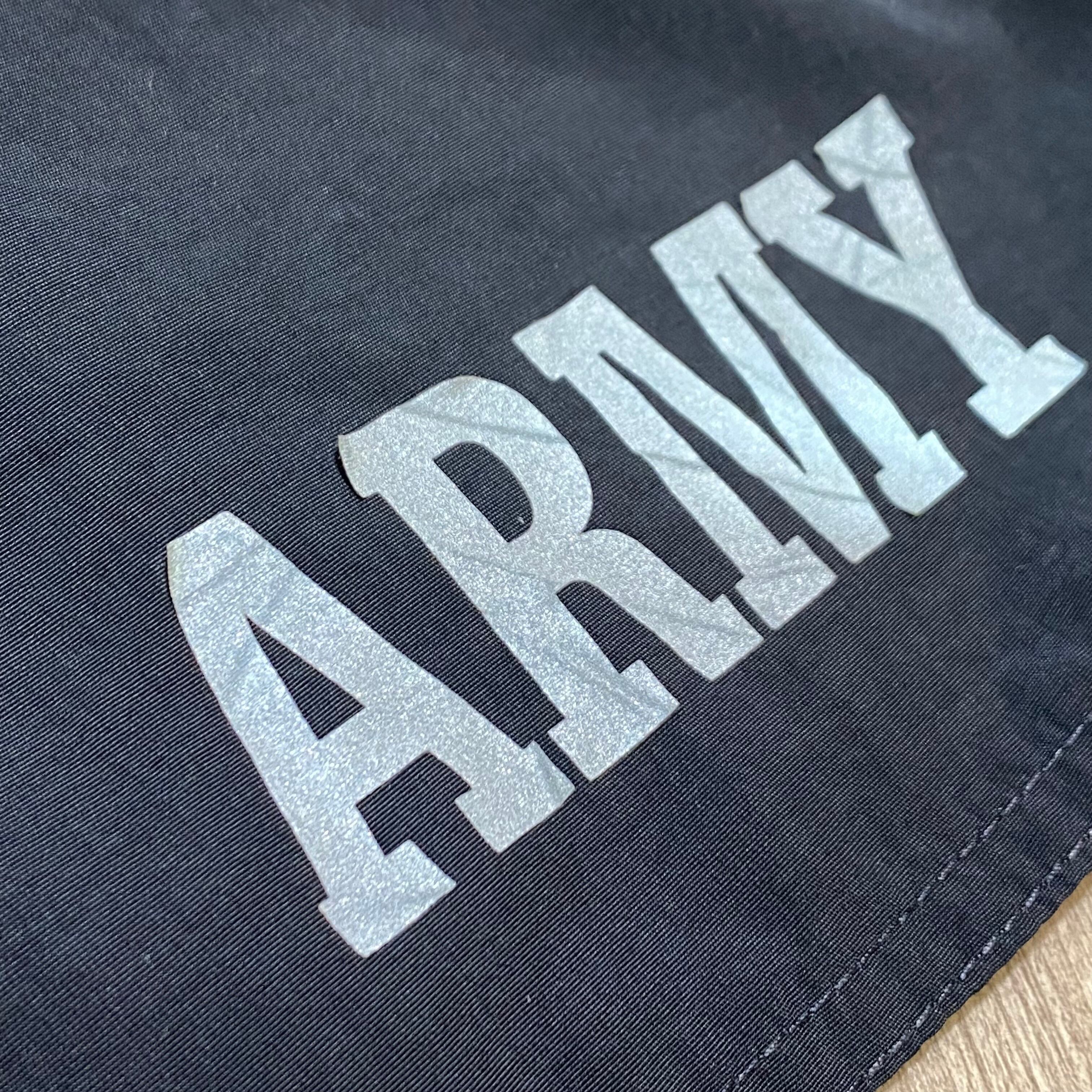 裾の「ARMY」のロゴは光に当たると反射するリフレクタープリント